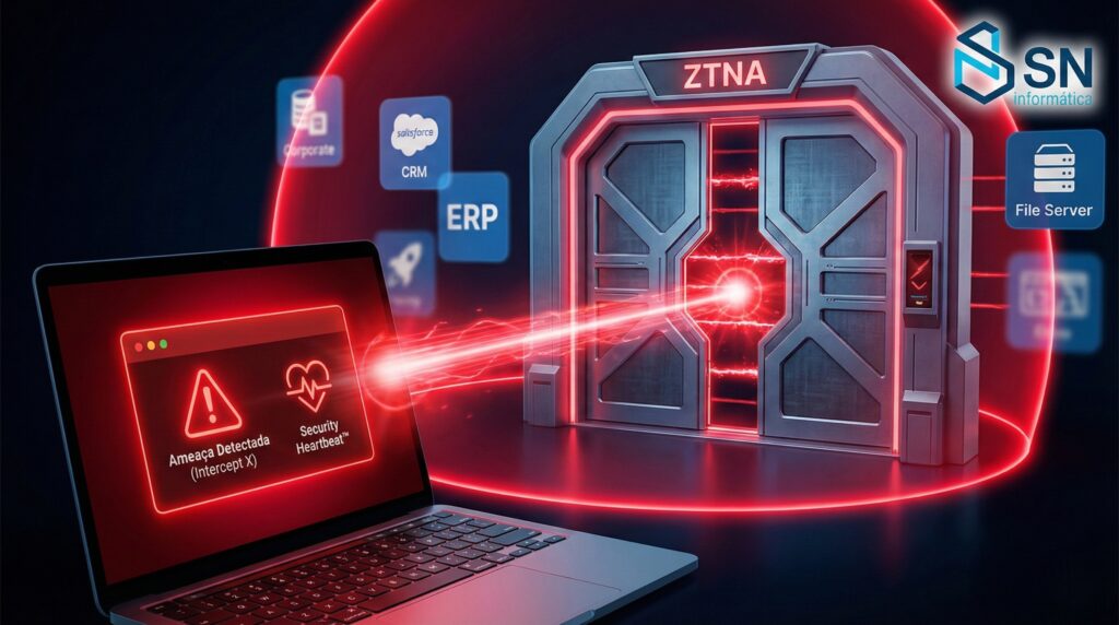 Se o Intercept X detecta uma ameaça ativa no endpoint (status Vermelho), o ZTNA corta imediatamente o acesso a todas as aplicações corporativas. Não é apenas um alerta; é uma resposta ativa e binária que isola o dispositivo infectado em tempo real, impedindo o sequestro de dados antes mesmo que a equipe de TI possa intervir.