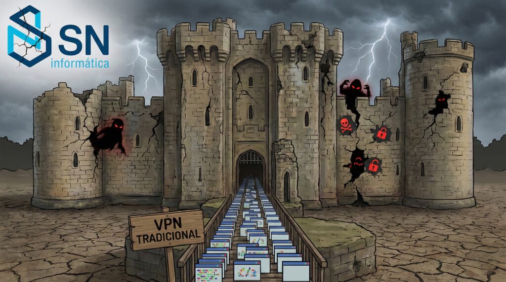 A arquitetura de VPN foi construída sobre o modelo de “castelo e fosso”, onde o perímetro era o limite. No cenário atual de trabalho híbrido e aplicações em nuvem, a VPN tornou-se uma vulnerabilidade ativa.
